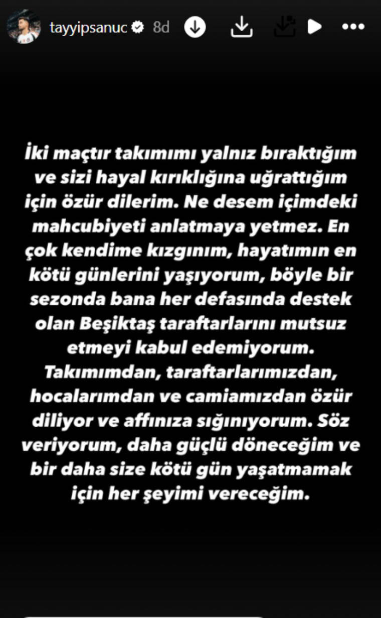 25 yaşındaki oyuncu 1-1 biten Kasımpaşa maçının ardından sosyal medya hesabından yaptığı paylaşım ile siyah-beyazlı taraftarlardan özür diledi.