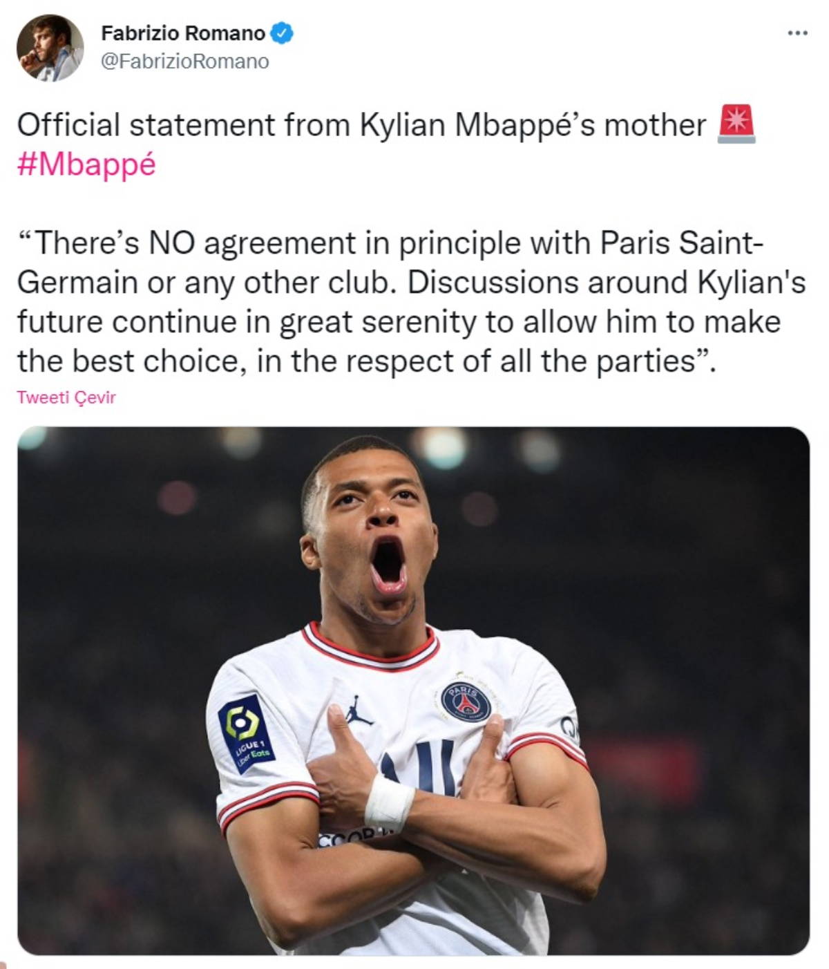 Ortaya atılan iddiaların ardından İtalyan gazeteci Fabrizio Romano, Mbappe’ye yakın kaynakların ‘PSG ile anlaşma’ haberlerinin gerçeği yansıtmadığını söylediğini yazdı. Daha sonra bir paylaşım daha yapan Romano, Mbappe’nin annesinin açıklamasına yer verdi: