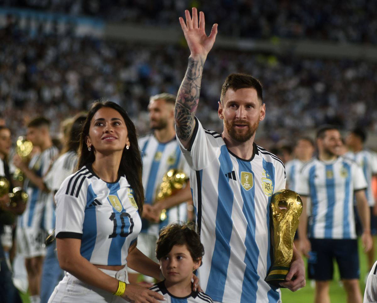 Arjantinli futbolcular, başlama vuruşundan önce Dünya Kupası'nın önünde fotoğraf çektirirken, Messi, teknik direktör Lionel Scaloni ve diğer oyuncular ailelerini stada getirdi.