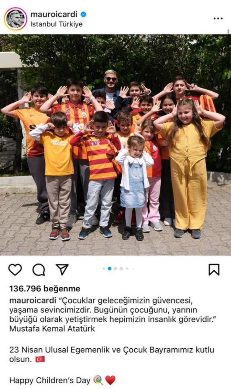 Icardi, Ulu Önder Mustafa Kemal Atatürk'ün, "Çocuklar geleceğimizin güvencesi, yaşama sevincimizdir. Bugünün çocuğunu, yarının büyüğü olarak yetiştirmek hepimizin insanlık görevidir" sözlerini paylaşarak "23 Nisan Ulusal Egemenlik ve Çocuk Bayramımız kutlu olsun" ifadelerini kullandı.