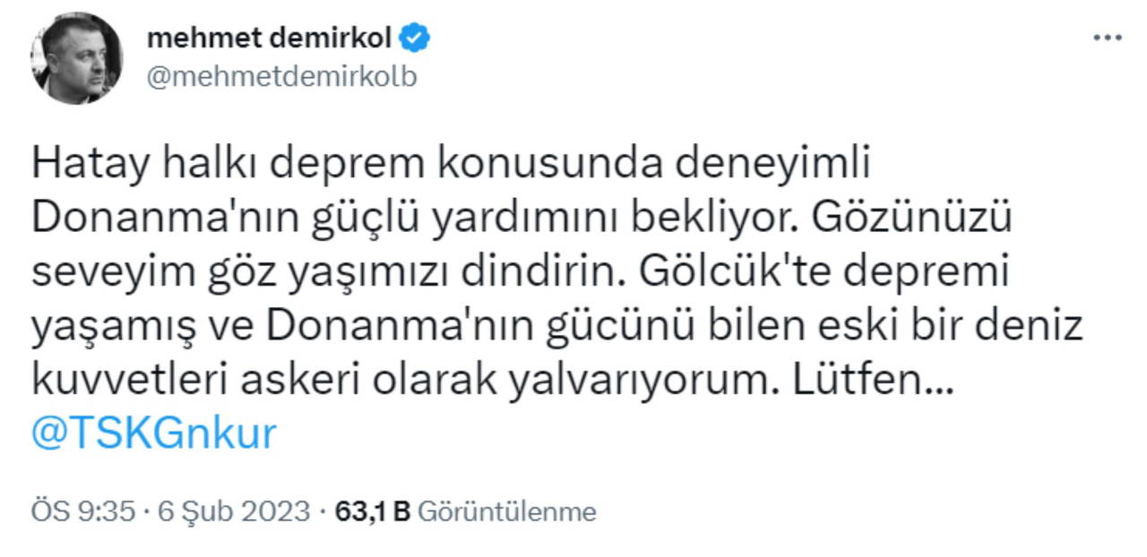 "Hatay halkı deprem konusunda deneyimli Donanma'nın güçlü yardımını bekliyor. Gözünüzü seveyim göz yaşımızı dindirin. Gölcük'te depremi yaşamış ve Donanma'nın gücünü bilen eski bir deniz kuvvetleri askeri olarak yalvarıyorum. Lütfen... "