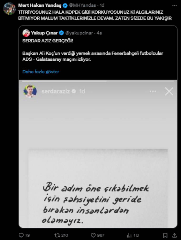 Mert Hakan'ın alıntıladığı gönderide ise "Serdar Aziz gerçeği; Başkan Ali Koç'un verdiği yemek sırasında Fenerbahçeli futbolcular Adana Demirspor - Galatasaray maçını izliyor. Serdar Aziz, Kerem Demirbay'ın golünden sonra "Ne güzel gol attı" diyor. Mert Hakan Yandaş ise Serdar'la bu tepkisi sonrası ciddi bir tartışma yaşıyor. Serdar Aziz silmesine rağmen Mert Hakan Yandaş'a gönderme yaptığı paylaşımın ardından kadro dışı bırakılıyor." ifadeleri yer aldı.