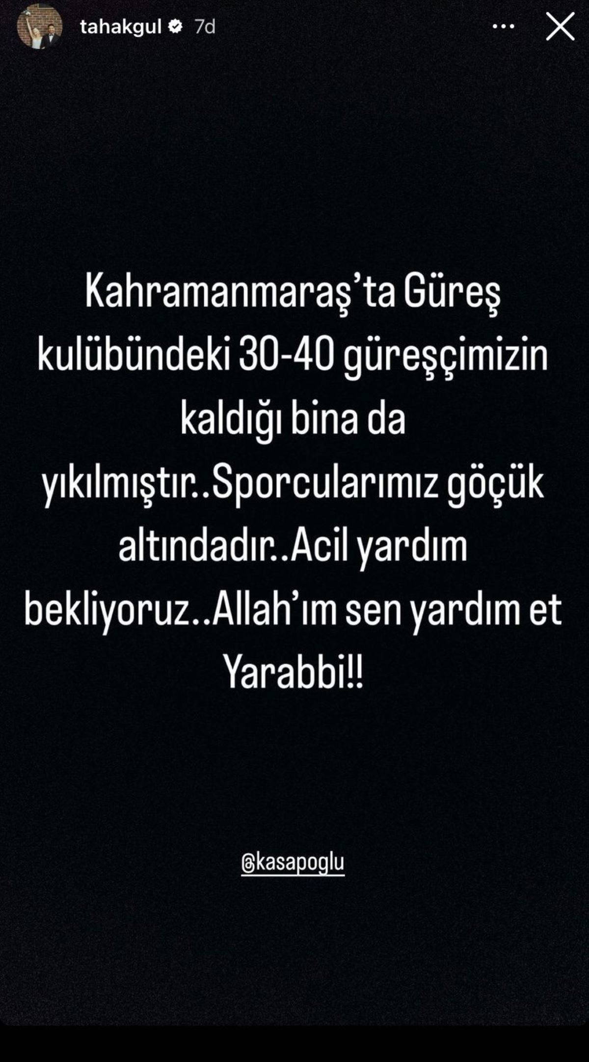 Doğu, Güneydoğu, İç Anadolu ve Akdeniz bölgesinde birçok ili etkileyen 7,4 büyüklüğünde Kahramanmaraş merkezli gerçekleşen deprem sonrası milli güreşçi Taha Akgül, sosyal medyadan yardım çağrısında bulundu. Akgül, "Kahramanmaraş'ta güreş kulübündeki 30-40 güreşçimizin kaldığı bina da yıkılmıştır… Sporcularımız göçük altındadır. Acil yardım bekliyoruz. Allah'ım sen yardım et yarabbi!" paylaşımında bulundu.