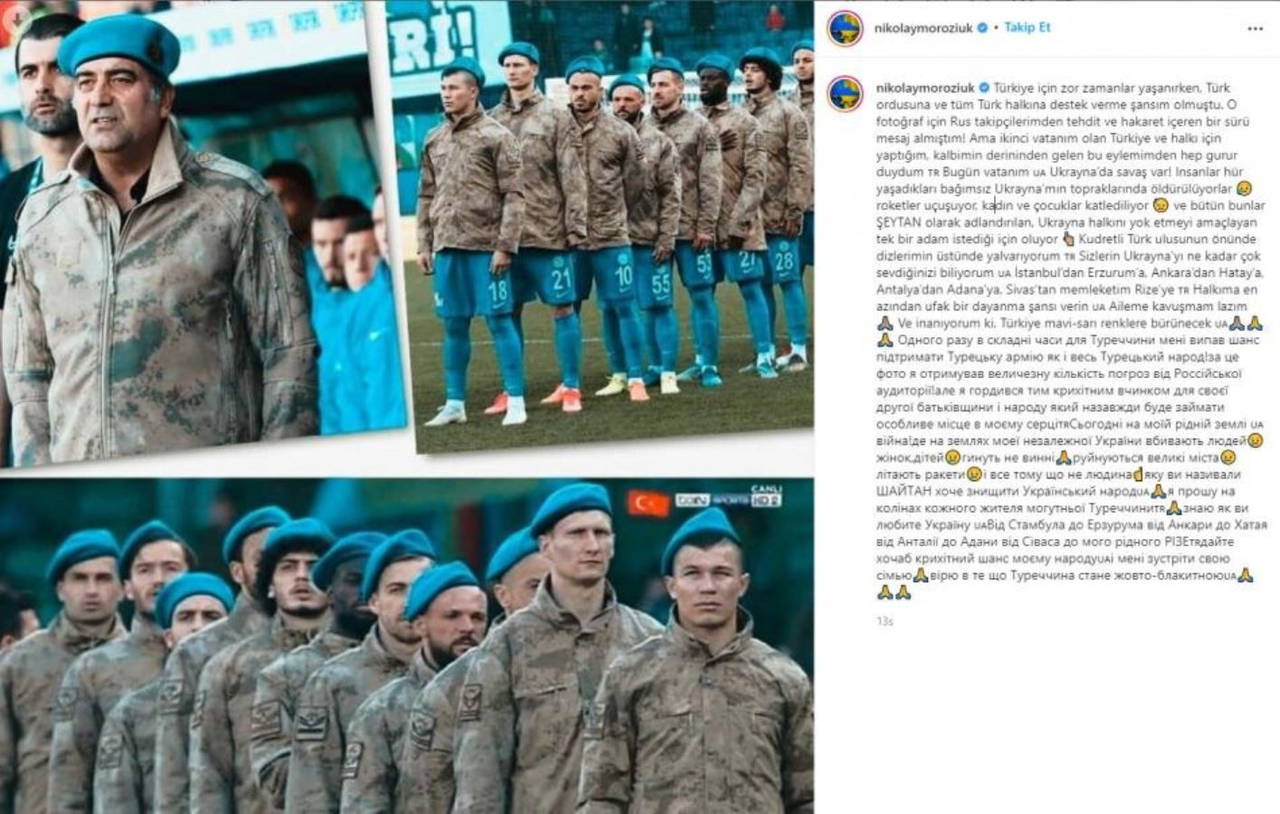 Mykola Morozyuk "Türkiye için zor zamanlar yaşanırken, Türk ordusuna ve tüm Türk halkına destek verme şansım olmuştu. O fotoğraf için Rus takipçilerimden tehdit ve hakaret içeren bir sürü mesaj almıştım! Ama ikinci vatanım olan Türkiye ve halkı için yaptığım, kalbimin derininden gelen bu eylemimden hep gurur duydum. Bugün vatanım Ukrayna’da savaş var! İnsanlar hür yaşadıkları bağımsız Ukrayna’mın topraklarında öldürülüyorlar." dedi.