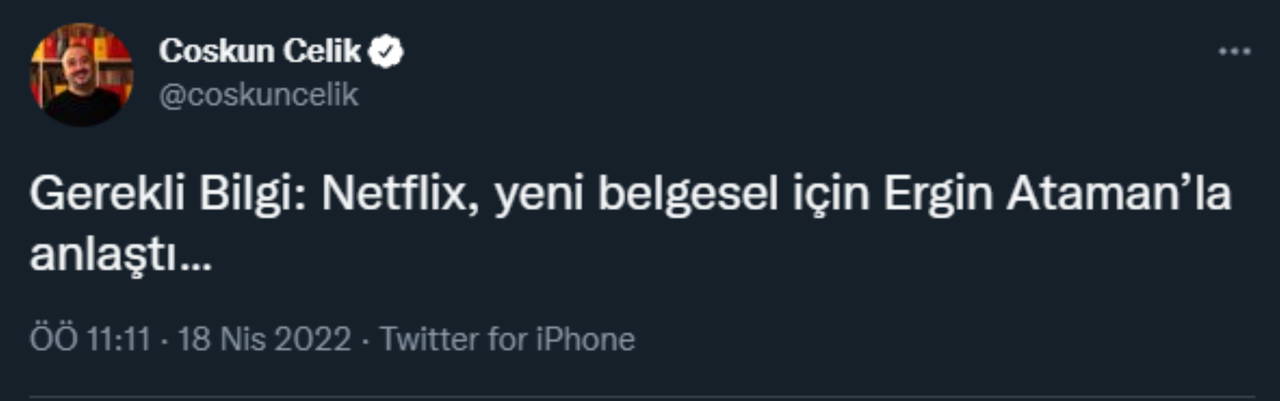 Gazeteci Coşkun Çelik'in haberine göre, çevrimiçi dizi film izleme platformu Netflix, deneyimli çalıştırıcı Ergin Ataman ile bir belgesel çekmeye hazırlanıyor. Çelik, sosyal medya hesabından yaptığı paylaşımda, "Gerekli Bilgi: Netflix, yeni belgesel için Ergin Ataman’la anlaştı…" diye yazdı.