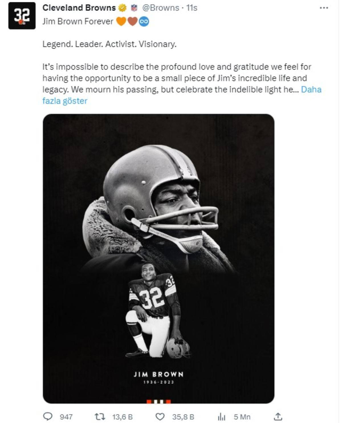 NFL'de 9 sezon boyunca formasını giydiği Cleveland, Jim Brown için bir anma mesajı yayımladı.
