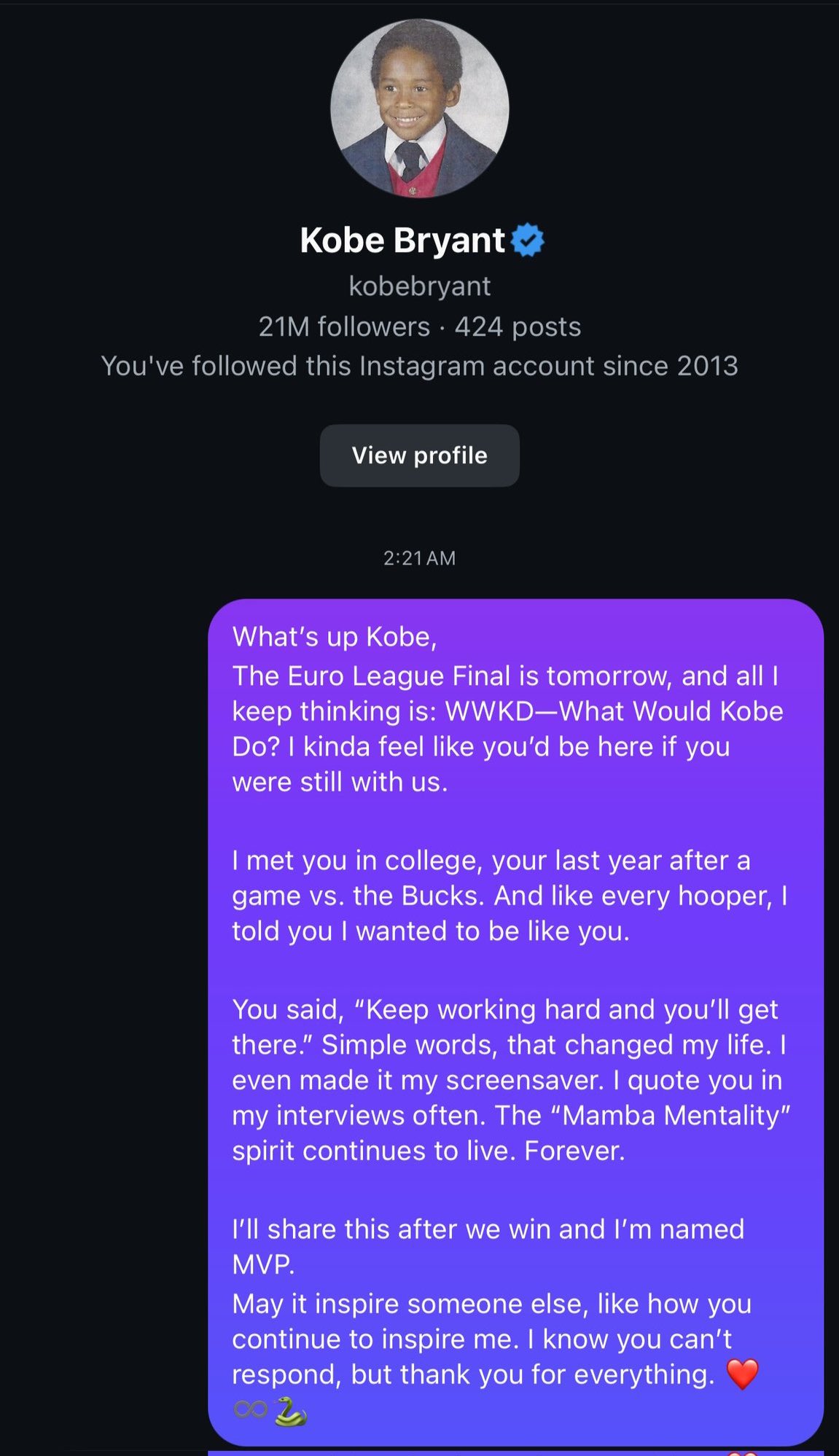 Bana "Çok çalışmaya devam et, orada olacaksın" demiştin. Basit sözler ama hayatımı değiştirdi. Bunu ekran koruyucum bile yaptım. Senin sözünü röportajlarımda sıklıkla kullanıyorum. 'Mamba Mentalitesi' ruhu yaşamaya devam ediyor. Sonsuza dek.