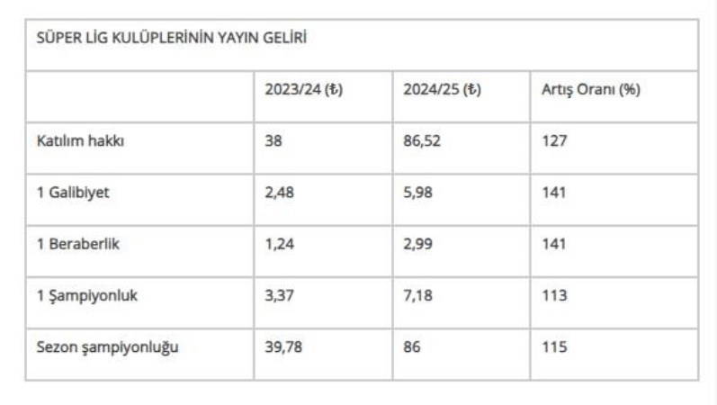 Süper Lig’de 19 takımla oynanacak 2024-25 sezonunda, takımların minimum yayın geliri payları ve bu payların bu sezonla (2023-24) karşılaştırması şöyle: