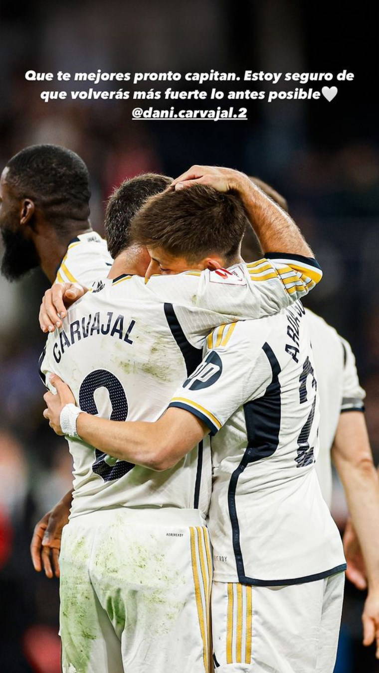 Oyunu sedyeyle terk eden Dani Carvajal için paylaşım yapan Arda Güler, "Geçmiş olsun kaptan. En kısa zamanda daha güçlü bir şekilde geri döneceğine eminim" ifadelerini kullandı.