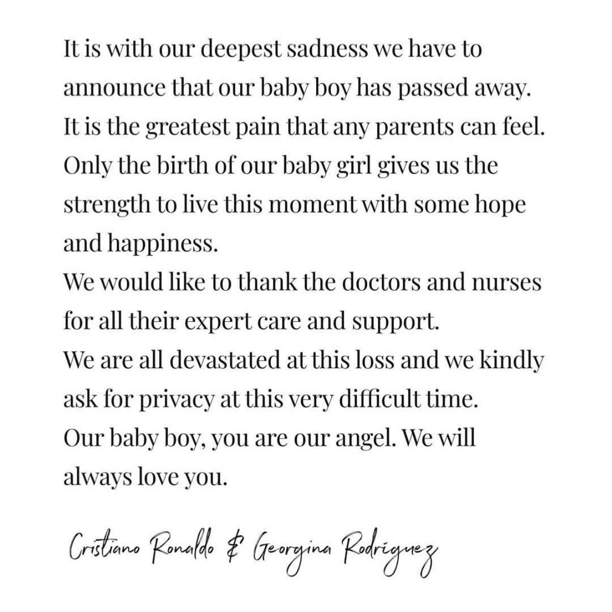Sosyal medya hesabından hayat arkadaşı Georgina Rodriguez ile birlikte ortak bir açıklama yapan 37 yaşındaki futbolcu "Yenidoğan oğlumuzu maalesef kaybettik. Çok üzüntülüyüz. Bu, bir anne ve bir babanın yaşayabileceği en büyük acı. Kızımızın doğumu, biraz da olsa şu anda bize güç, umut ve mutluluk veriyor... Canım oğlumuz, sen bizim meleğimizsin. Seni her zaman seveceğiz" ifadelerini kullandı.