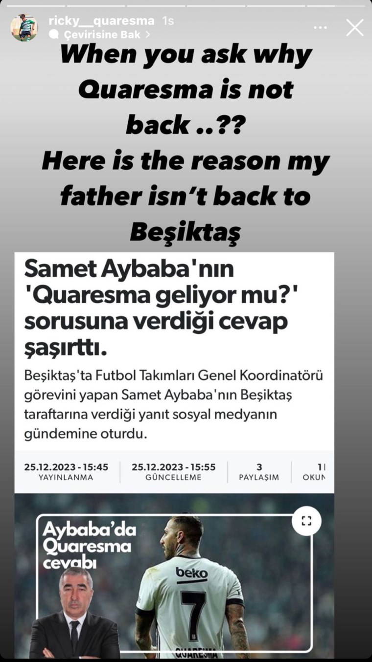 Ricky paylaşımında Samet Aybaba'nın Quaresma sözlerini içeren haberi alıntıladı ve "İşte babamın Beşiktaş'a dönmemesinin sebebi" notunu düştü.