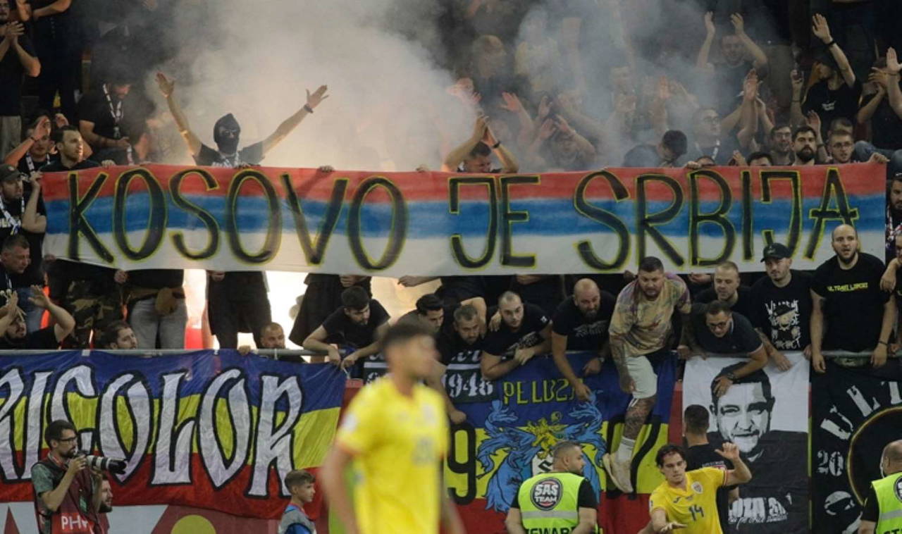 Rumen taraftarlar, Kosova'nın ulusal marşı okunduğu sırada "Sırbistan" tezahüratı yaptı. Daha sonra tribünlerde "Kosova Sırbistan'dır" pankartı açıldı.