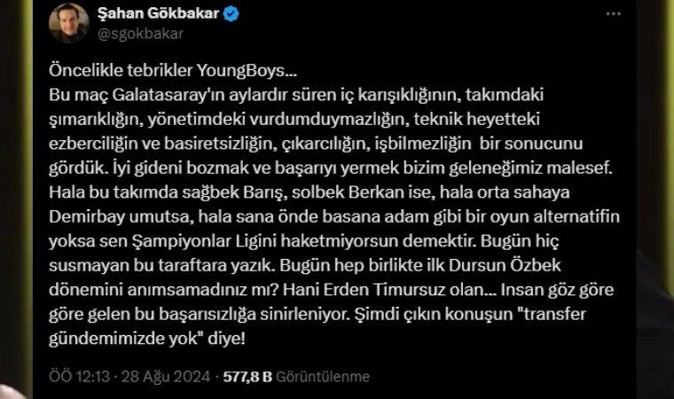 Şahan Gökbakar, alınan yenilginin ardından mevcut Galatasaray yönetimini eleştirdi.