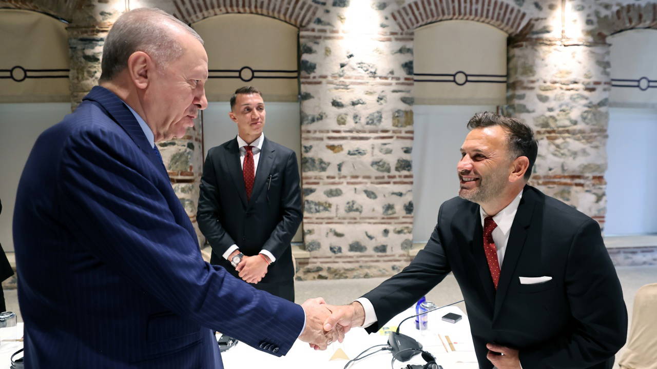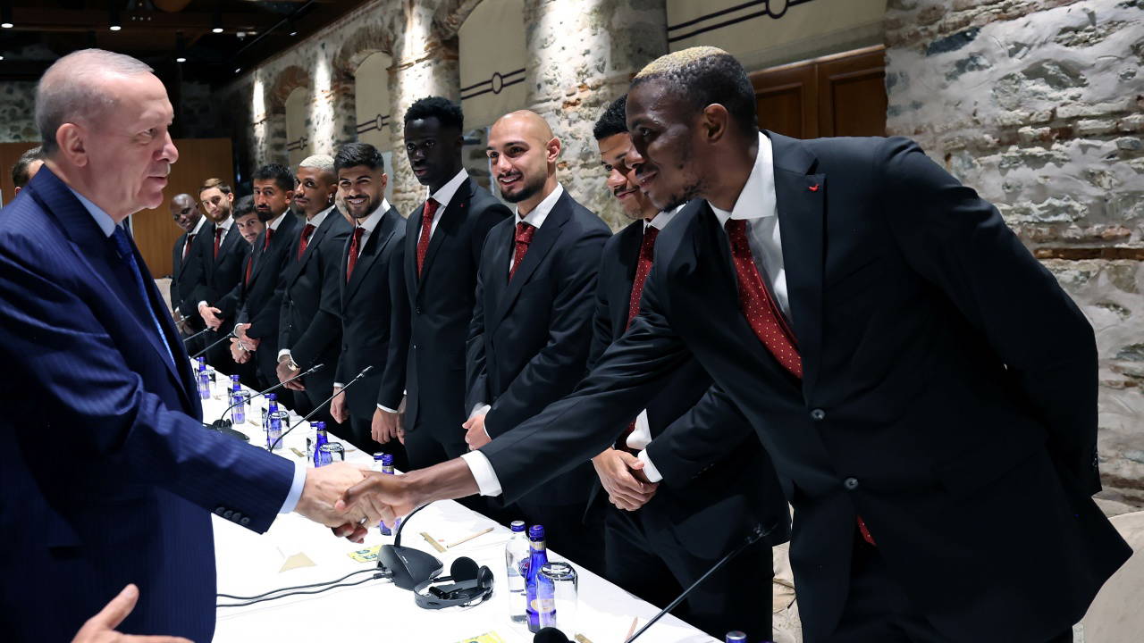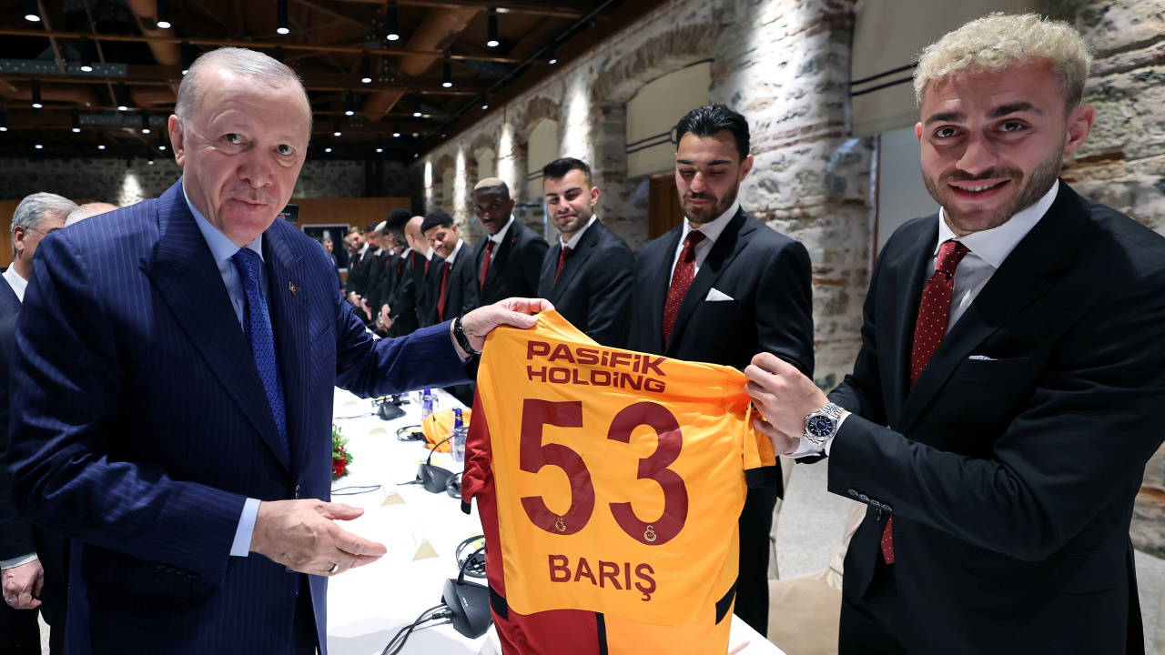 Galatasaray Kulübü Başkanı Dursun Özbek, futbolcular ve teknik heyetle tek tek tokalaşan Erdoğan, Süper Lig'deki 25. şampiyonluğunu elde eden sarı-kırmızılı ekibi tebrik etti.
