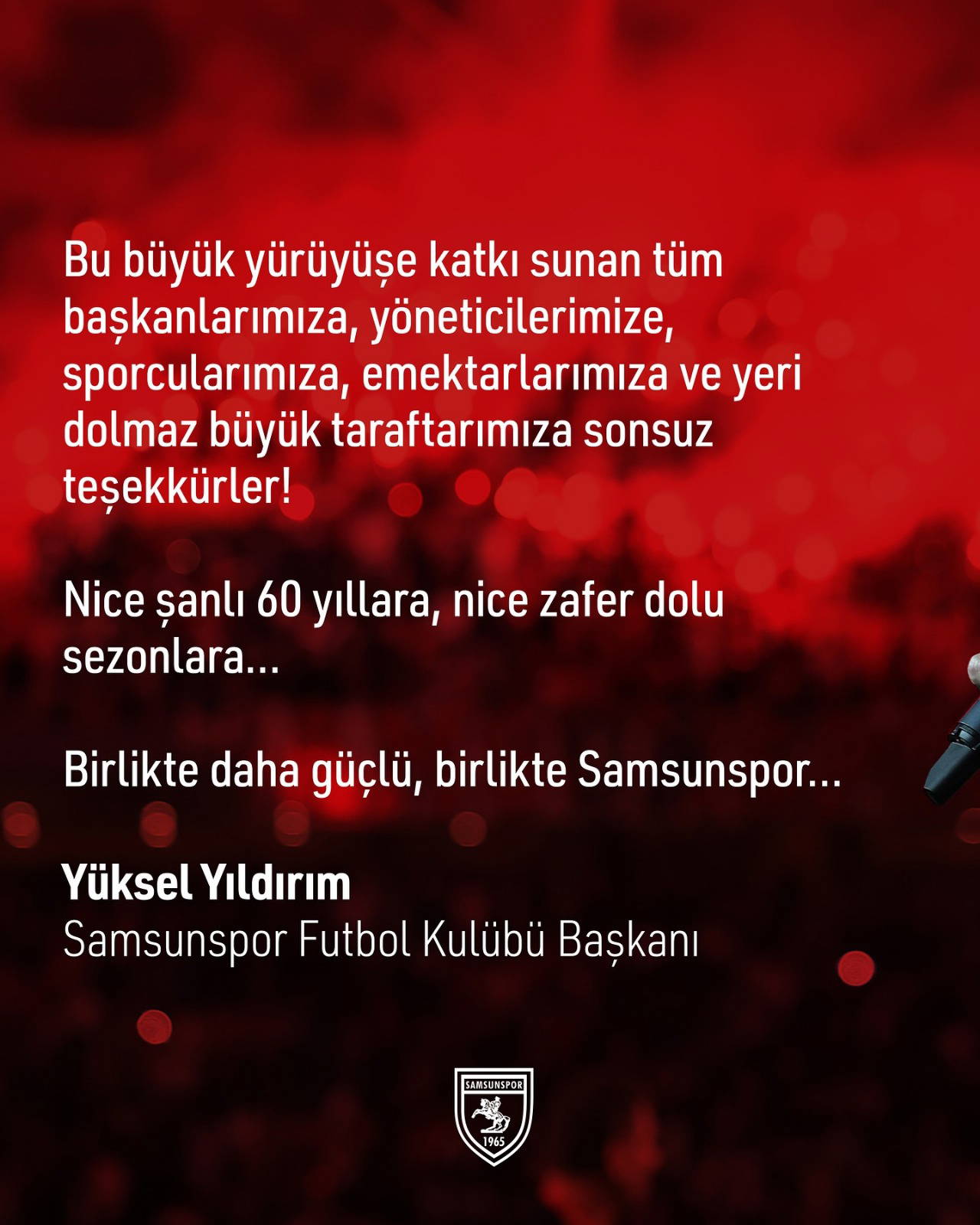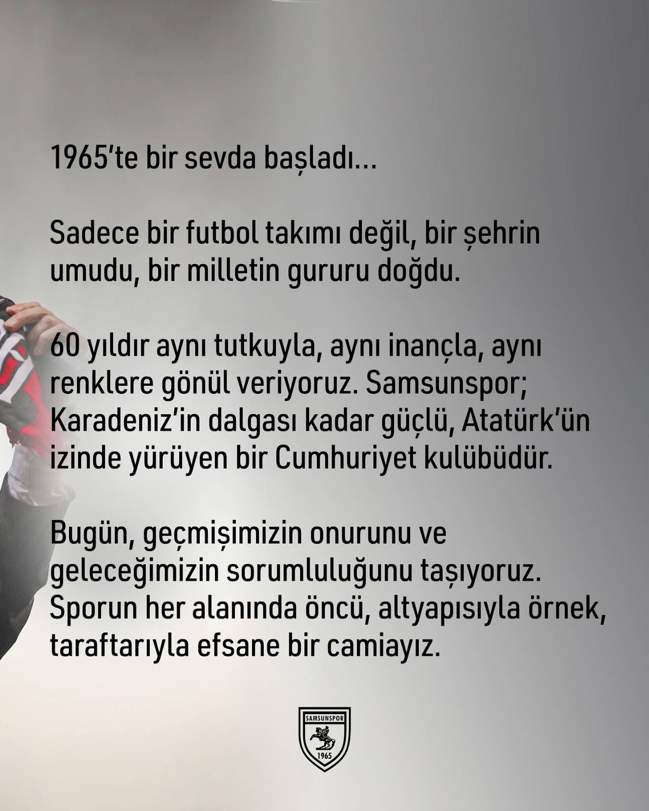 “60 yıl önce, bir hayalin peşinden koşarak başladık” ifadeleriyle başlayan mesajda, kulübün zorlu dönemlerden geçmesine rağmen hiçbir engelin Samsunspor’un yürüyüşünü durduramadığı belirtildi. Her zaferin ve her kaybın ardından yeniden doğarak daha güçlü bir şekilde yola devam ettiklerini belirten kırmızı-beyazlılar, bu yolculukta kendilerini yalnız bırakmayan taraftarlara da teşekkür etti.