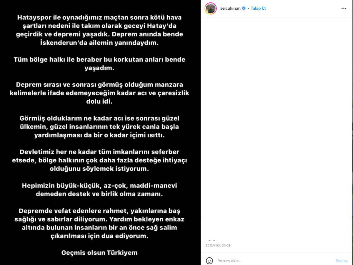 "Hatayspor ile oynadığımız maçtan sonra kötü hava şartları nedeniyle takım olarak geceyi Hatay'da geçirdik ve depremi yaşadık. Deprem anında bende İskenderun'da ailemin yanındaydım.