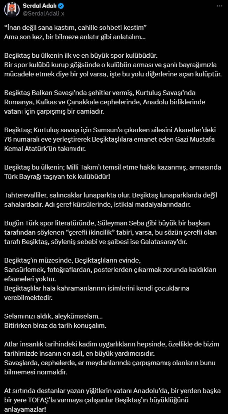 Galatasaray ile Beşiktaş arasındaki derbinin yankıları devam ediyor. Derbinin ardından özellikle hakem kararlarına yönelik iki taraftan da açıklamalar gelirken Serdal Adalı'dan dikkat çeken bir paylaşım geldi.