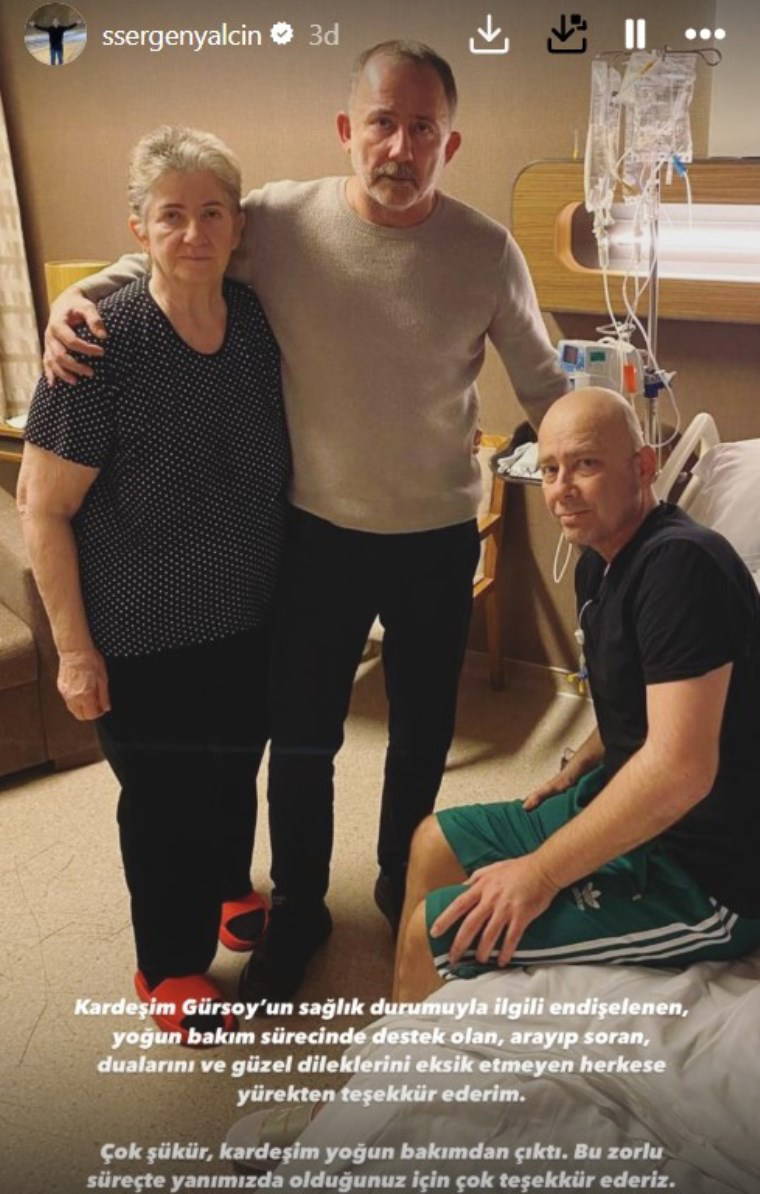 Sergen Yalçın, sosyal medya hesabından yaptığı açıklamada, "Kardeşim Gürsoy'un sağlık durumuyla ilgili endişelenen, yoğun bakım sürecinde destek olan, arayıp soran, dualarını ve güzel dileklerini eksik etmeyen herkese yürekten teşekkür ederim. Çok şükür, kardeşim yoğun bakımdan çıktı. Bu zorlu süreçte yanımızda olduğunuz için çok teşekkür ederiz." ifadelerini kullandı.