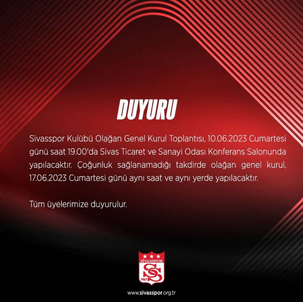 Kırmızı-beyazlı kulübün internet sitesinden yapılan açıklamada, “Sivasspor Kulübü Olağan Genel Kurul Toplantısı, 10.06.2023 Cumartesi günü saat 19.00’da Sivas Ticaret ve Sanayi Odası Konferans Salonunda yapılacaktır. Çoğunluk sağlanamadığı takdirde olağan genel kurul, 17.06.2023 Cumartesi günü aynı saat ve aynı yerde yapılacaktır. Tüm üyelerimize duyurulur” denildi.