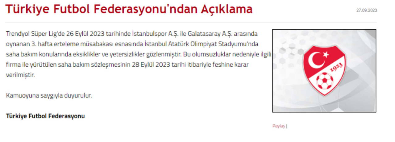 Federasyonun internet sitesinden yapılan açıklamada, Trendyol Süper Lig'de İstanbulspor ile Galatasaray arasında oynanan 3. hafta erteleme müsabakası esnasında İstanbul Atatürk Olimpiyat Stadyumu'nda saha bakım konularında eksiklikler ve yetersizliklerin gözlendiği belirtilerek, "Bu olumsuzluklar nedeniyle ilgili firma ile yürütülen saha bakım sözleşmesinin 28 Eylül tarihi itibarıyla feshine karar verilmiştir." denildi.