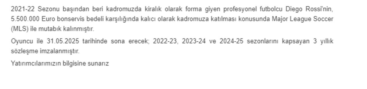 Sarı-lacivertlilerden yapılan açıklamada, "2021-22 Sezonu başından beri kadromuzda kiralık olarak forma giyen profesyonel futbolcu Diego Rossi'nin, 5.500.000 Euro bonservis bedeli karşılığında kalıcı olarak kadromuza katılması konusunda Major League Soccer (MLS) ile mutabık kalınmıştır" ifadeleri yer aldı.