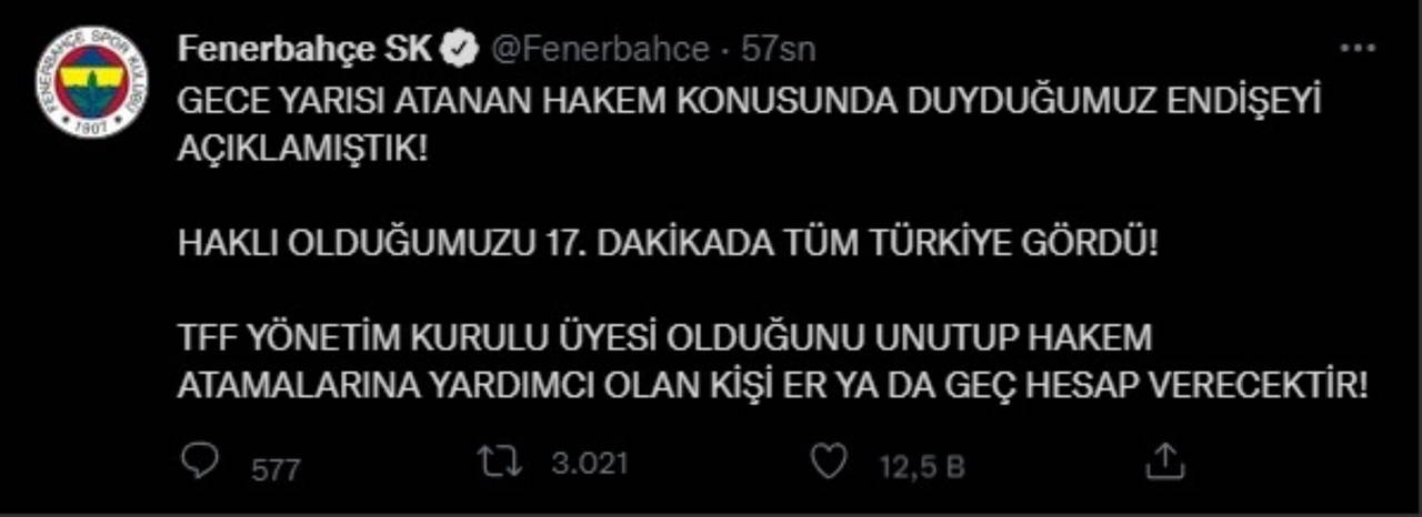 İlk yarının bitiş düdüğünün çalmasının ardından sarı-lacivertli kulübün sosyal medya hesabından flaş bir paylaşım yapıldı. Fenerbahçe, maçın hakemi Zorbay Küçük ve hakem atamalarına 'yardım ettiği' iddia edilen bir TFF Yönetim Kurulu üyesine tepki gösterdi.