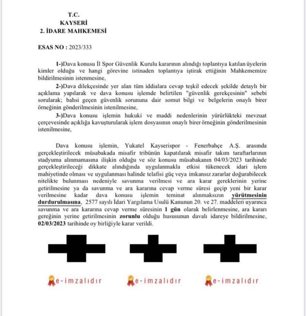 "Dava konusu işlemin Yukatel Kayserispor-Fenerbahçe AŞ arasında gerçekleştirilecek müsabakada misafir tribünün kapatılarak, misafir takım taraftarlarının stadyuma alınmamasına ilişkin olduğu ve söz konusu müsabakanın 4 Mart'ta gerçekleştirileceği dikkate alındığında uygulanmakla etkisi tükenecek idari işlem mahiyetinde olması ve uygulanması halinde telafisi güç veya imkansız zararlar doğurabilecek nitelikte bulunması nedeniyle savunma verilmesi ve ara karar gereklerinin yerine getirilmesine ya da savunma ve ara kararına cevap verme süresi geçip yeni bir karar verilmesine kadar dava konusu işlemin teminat alınmaksızın yürütmesinin durdurulmasına, 2577 sayılı İdari Yargılama Usulü Kanunu'nun 20. ve 27. maddeleri uyarınca savunma ve ara kararına cevap verme süresinin 1 gün olarak belirlenmesine, ara kararı gereğinin yerine getirilmesinin zorunlu olduğu hususunun davalı idareye bildirilmesine oy birliğiyle karar verildi."