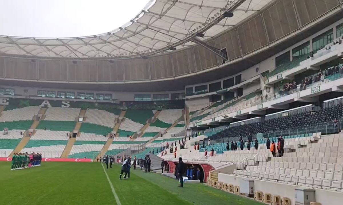 Bursa Büyükşehir Belediye Stadyumu’nda saat 14.00’te başlayan karşılaşma öncesi stadyumdaki ses sistemi arızalandı. İstiklal Marşı seslendirilemeyince, sahada hazır bekletilen ambulans devreye sokuldu.
