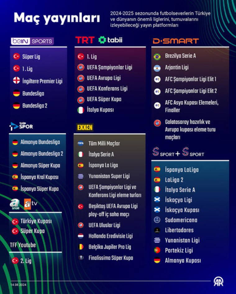 2024-25 sezonunda futbolseverlerlerin Türkiye'nin ve dünyanın önemli liglerini, turnuvalarını izleyebileceği yayın platformları belli oldu.