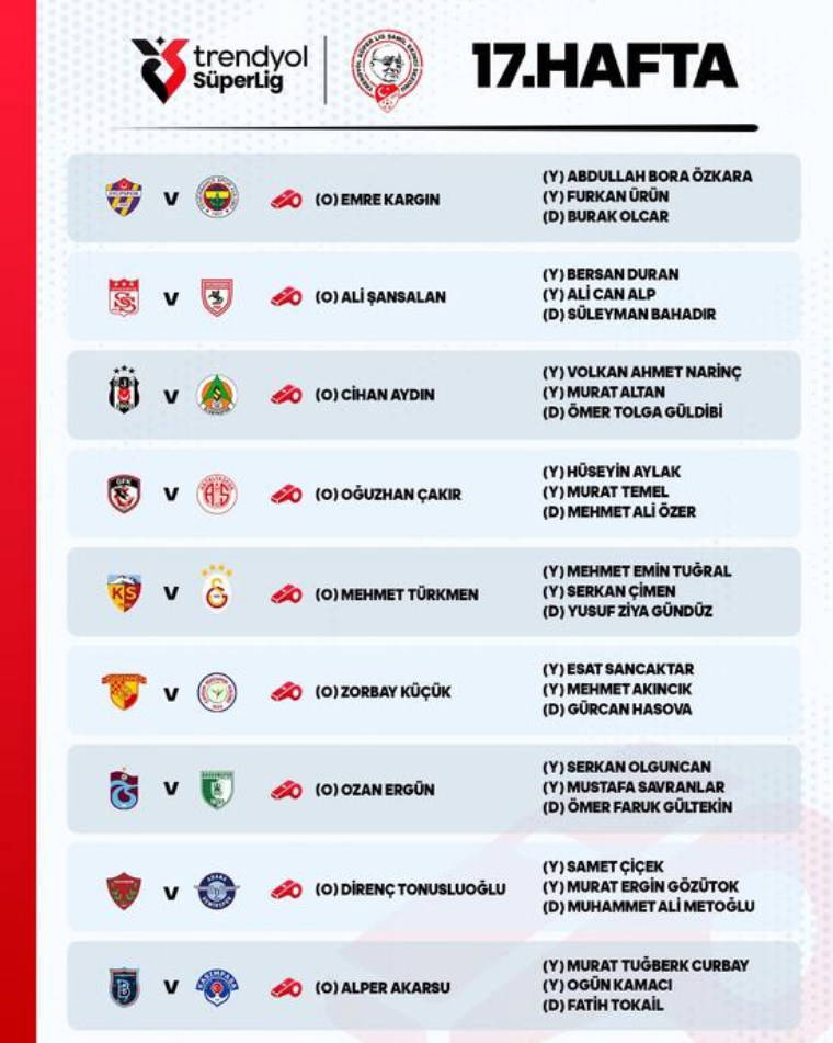 Eyüpspor - Fenerbahçe maçını Emre Kargın, Beşiktaş - Alanyaspor maçını Cihan Aydın, Kayserispor - Galatasaray maçını Mehmet Türkmen ve Trabzonspor - Bodrum FK maçını Ozan Ergün yönetecek.