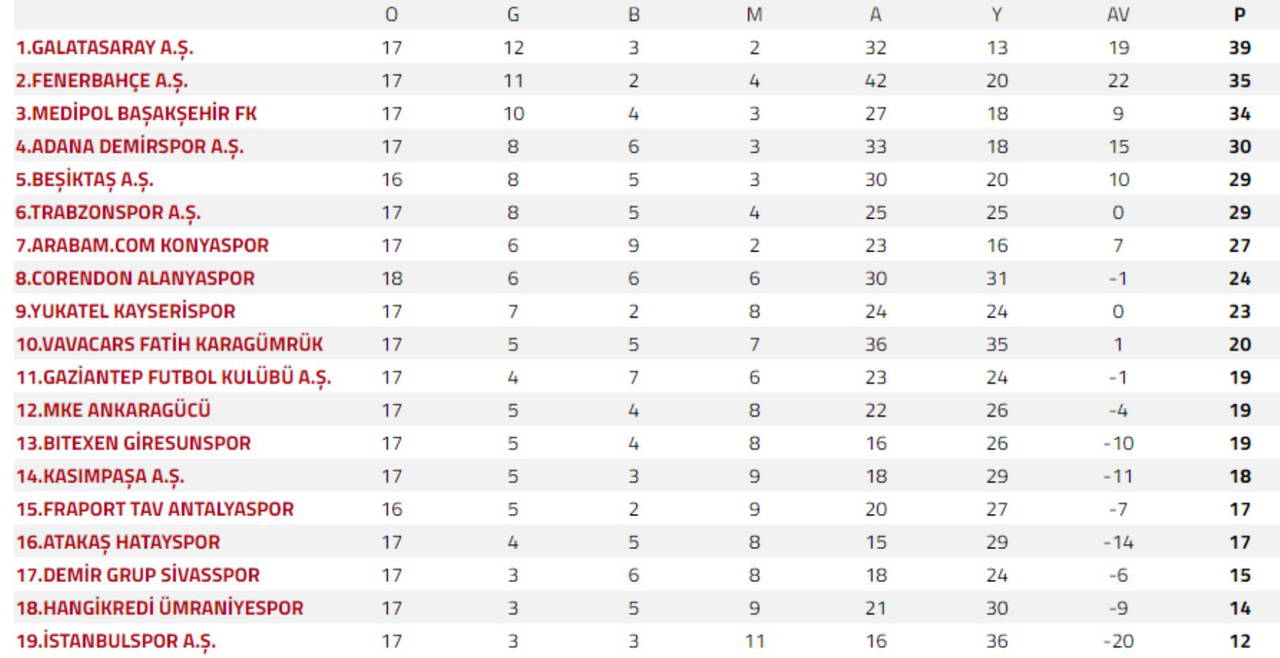 Tamamlanan haftanın ardından oluşan puan durumu şöyle: