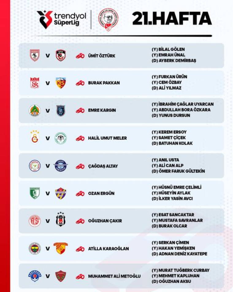 Süper Lig'in 21. haftasında düdük çalacak hakemler duyuruldu.