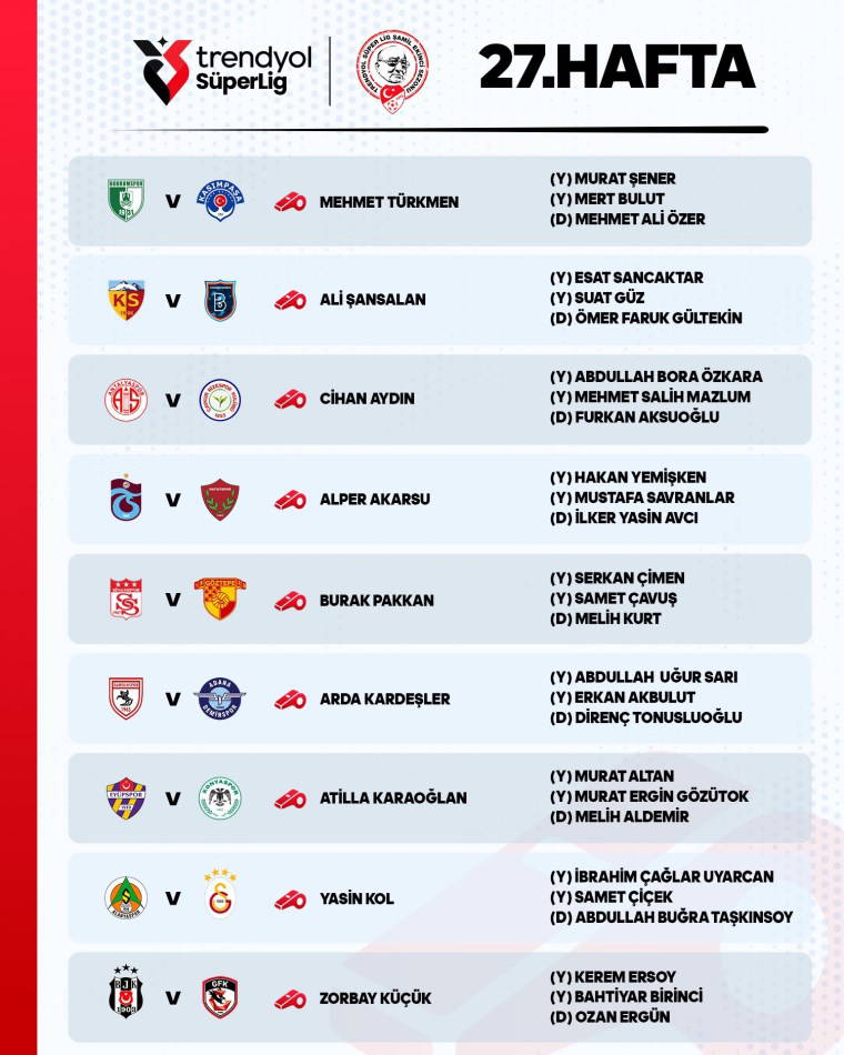 Türkiye Futbol Federasyonu Merkez Hakem Kurulundan yapılan açıklamaya göre haftanın maçlarını yönetecek hakemler şöyle: