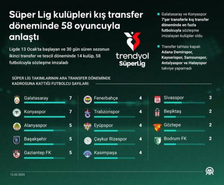 Trendyol Süper Lig takımları, 2. transfer ve tescil döneminde 58 futbolcuyu kadrosuna kattı.