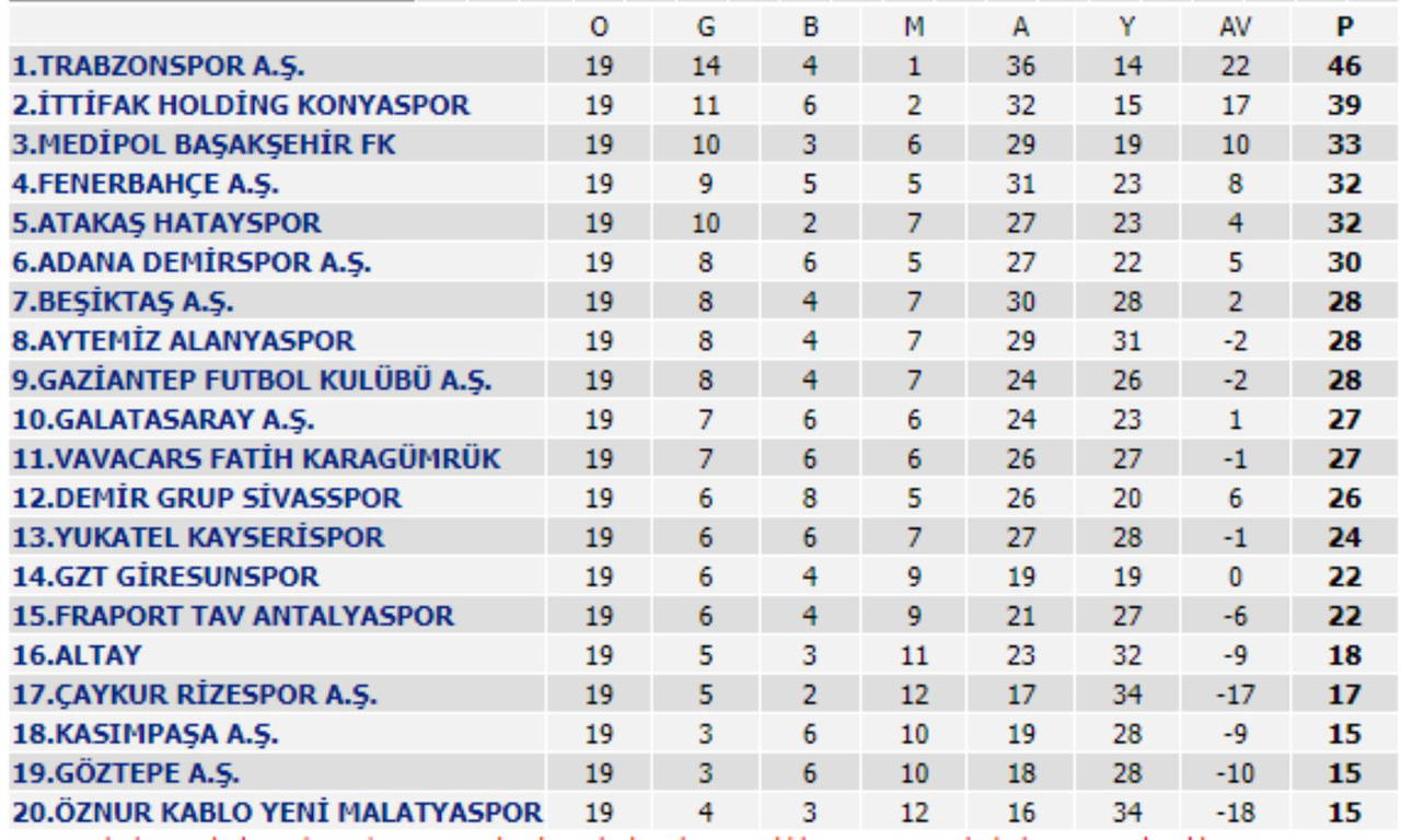 Düşme hattında ise 15'er puanı bulunan Öznur Kablo Yeni Malatyaspor, Göztepe ve Kasımpaşa ile 17 puanlı Çaykur Rizespor yer aldı.