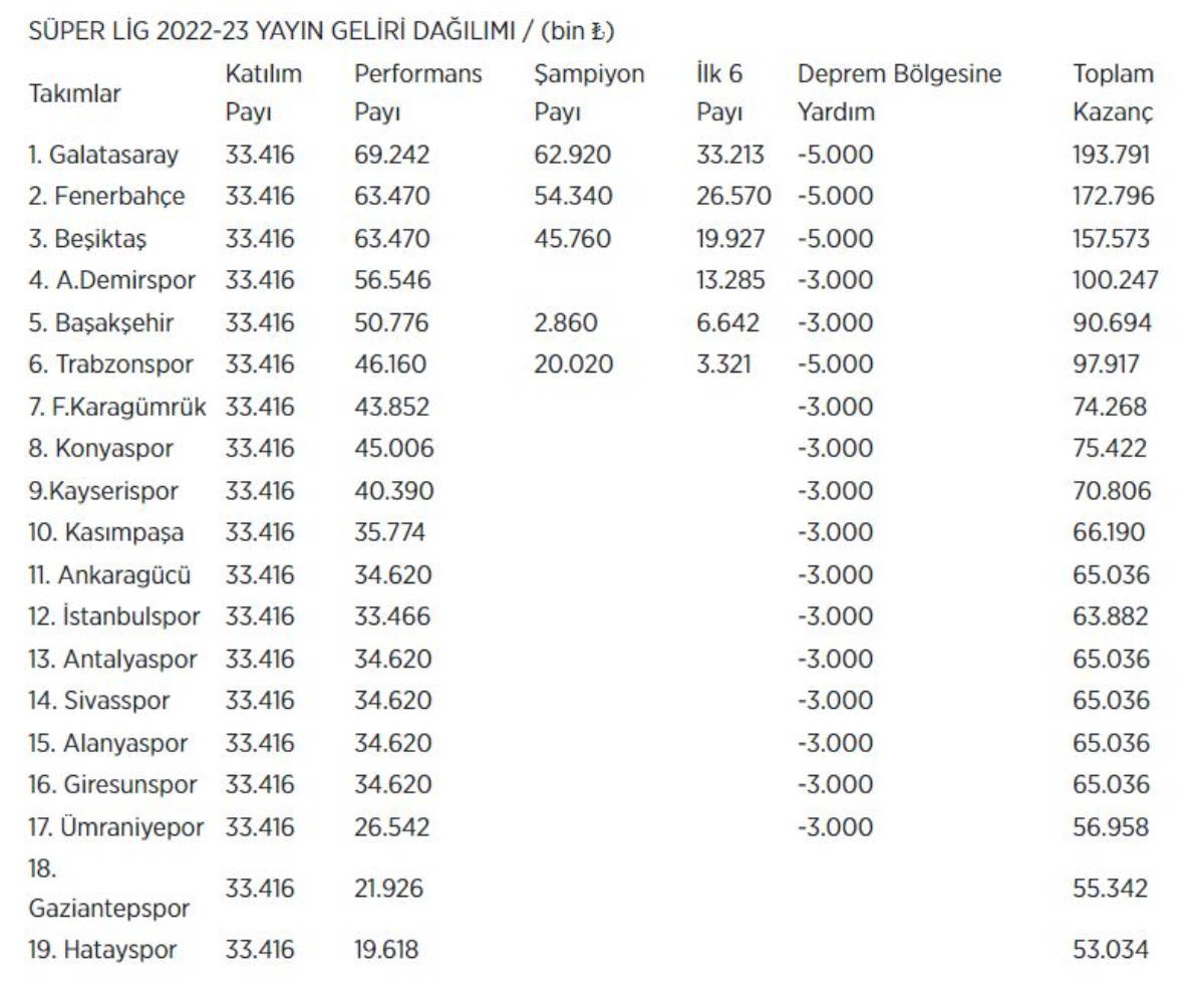 Süper Lig’de 2022-23 sezonu sıralamasına göre kulüplerin elde ettiği yayın geliri miktarları şöyle: