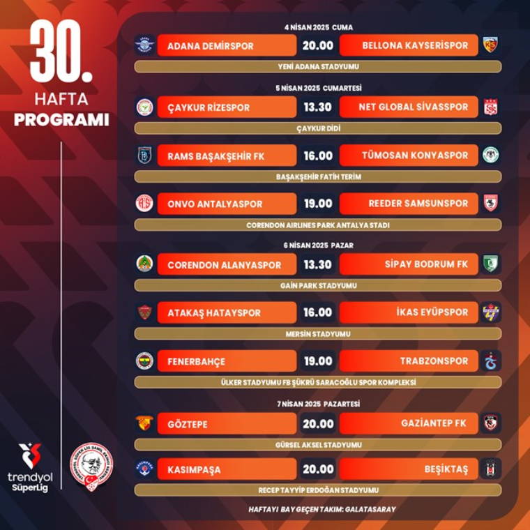 Trendyol Süper Lig'de 29 ve 30. haftaların maç programı şöyle: