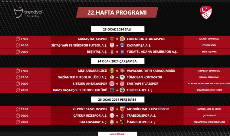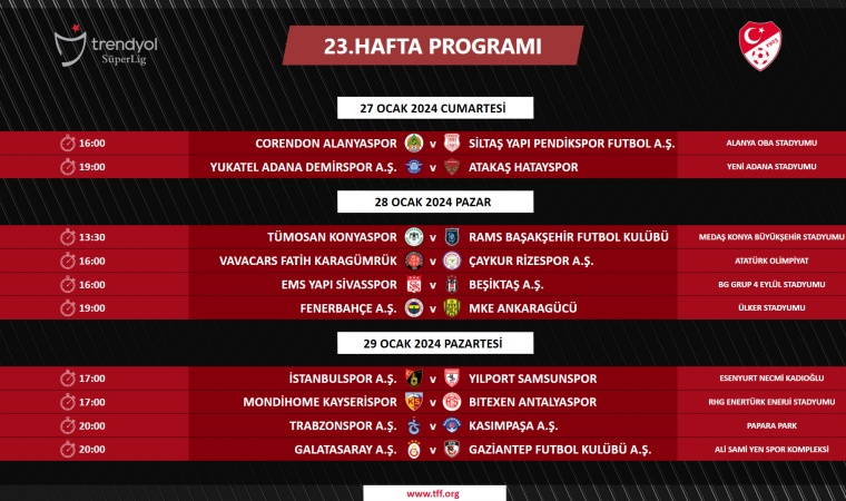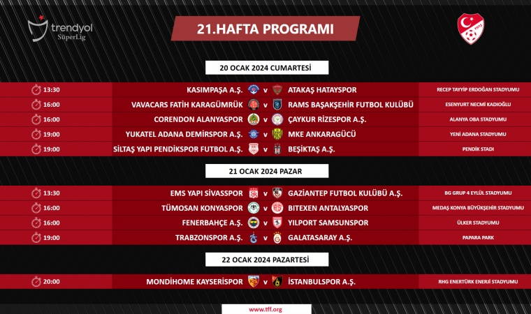 Süper Lig'de 21, 22 ve 23. hafta maç programı açıklandı.