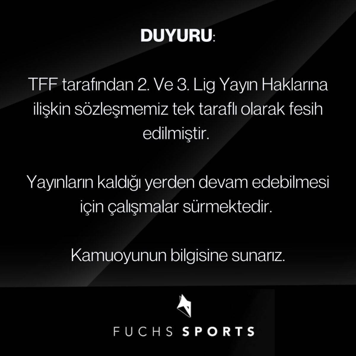 Konuyla ilgili Fuchs Sports’un sosyal medya hesabından yapılan açıklamada, "TFF tarafından 2. ve 3. Lig yayın haklarına ilişkin sözleşmemiz tek taraflı olarak fesih edilmiştir. Yayınların kaldığı yerden devam edebilmesi için çalışmalar sürmektedir. Kamuoyunun bilgisine sunarız" denildi.