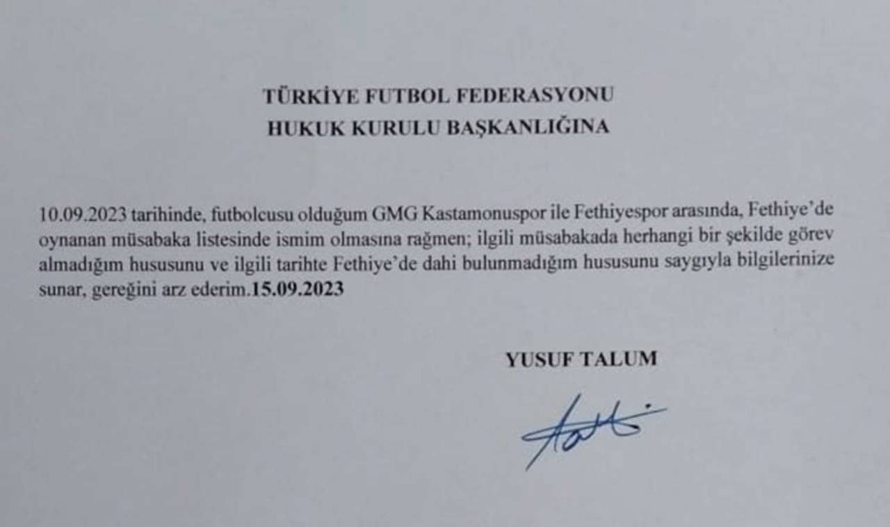 TFF 2'nci Lig Kırmızı Grup'taki Muğla temsilcisi Fethiyespor, 10 Eylül'de evinde 1-0 kaybettiği Kastamonuspor maçı sonrası TFF'ye başvurarak, rakibin deplasmana hiç gelmeyen futbolcu Yusuf Talum'u esame listesine yazdığını belirtip hükmen galibiyet talep etti. Kastamonuspor'dan geçen hafta 13 Eylül'de İnegölspor'a transfer olan genç futbolcu da federasyona verdiği savunma dilekçesinde Fethiye’ye hiç gitmediğini kabul etti.