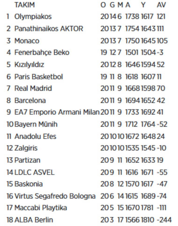 Organizasyonun 20. haftasında yapılan müsabakaların ardından oluşan puan durumu şöyle: