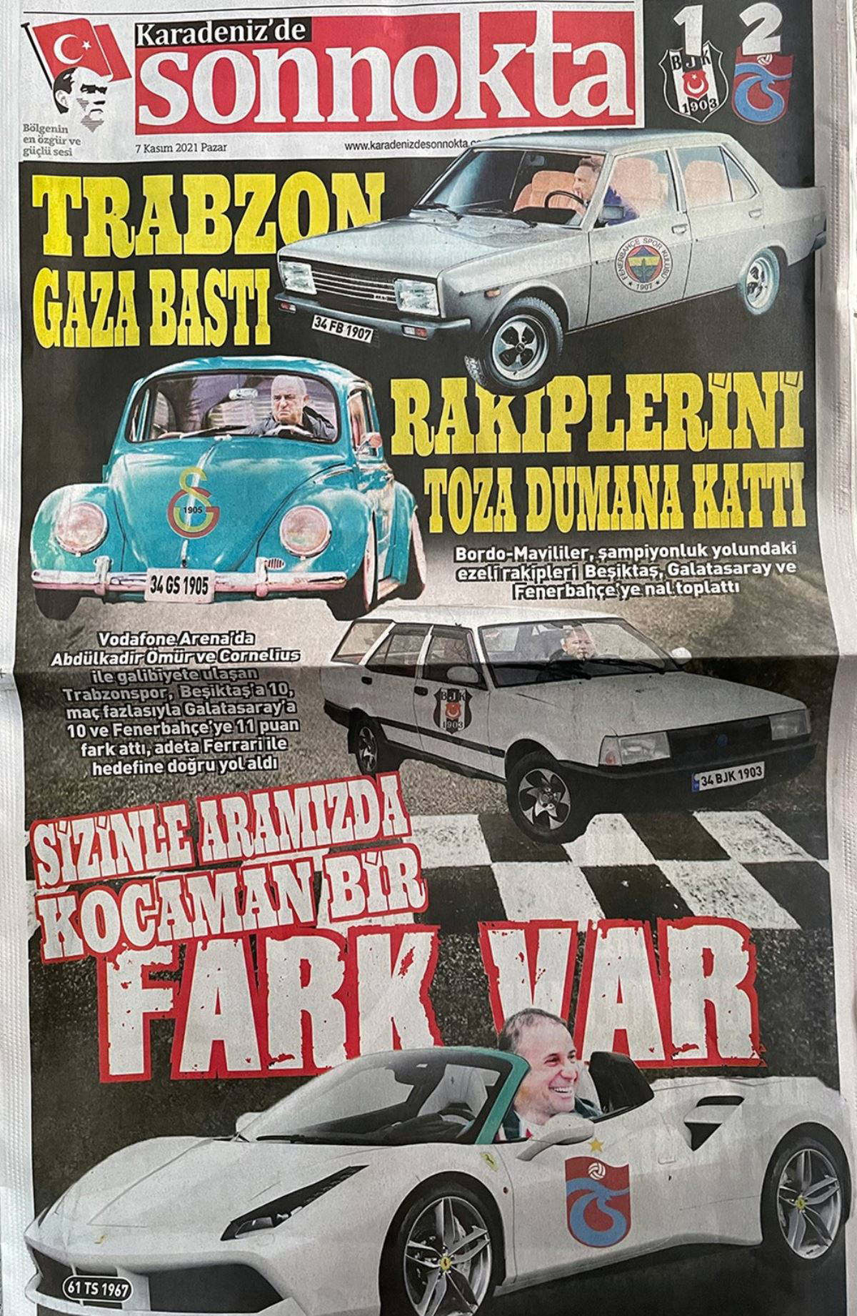 Karadeniz'de Son Nokta gazetesi, birinci sayfasında, farklı bir tasarım ile okuyucularına galibiyet sevincini aktardı. Üç farklı otomobilin yer aldığı haberde, "Trabzon gaza bastı", "Rakiplerini toza dumana kattı" ve "Sizinle aramızda kocaman bir fark var" başlıklarına yer verildi.