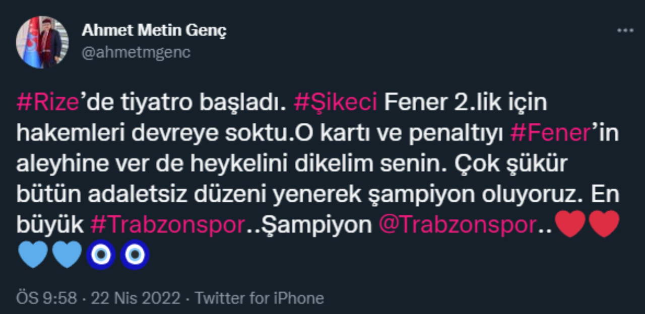 Tweet'inde "Rize'de tiyatro başladı. Şikeci Fener 2.lik için hakemleri devreye soktu. O kartı ve penaltıyı Fener’in aleyhine ver de heykelini dikelim senin. Çok şükür bütün adaletsiz düzeni yenerek şampiyon oluyoruz. En büyük Trabzonspor. Şampiyon Trabzonspor" ifadelerini kullanan Genç'in bu paylaşımı kısa süre içerisinde yayıldı.
