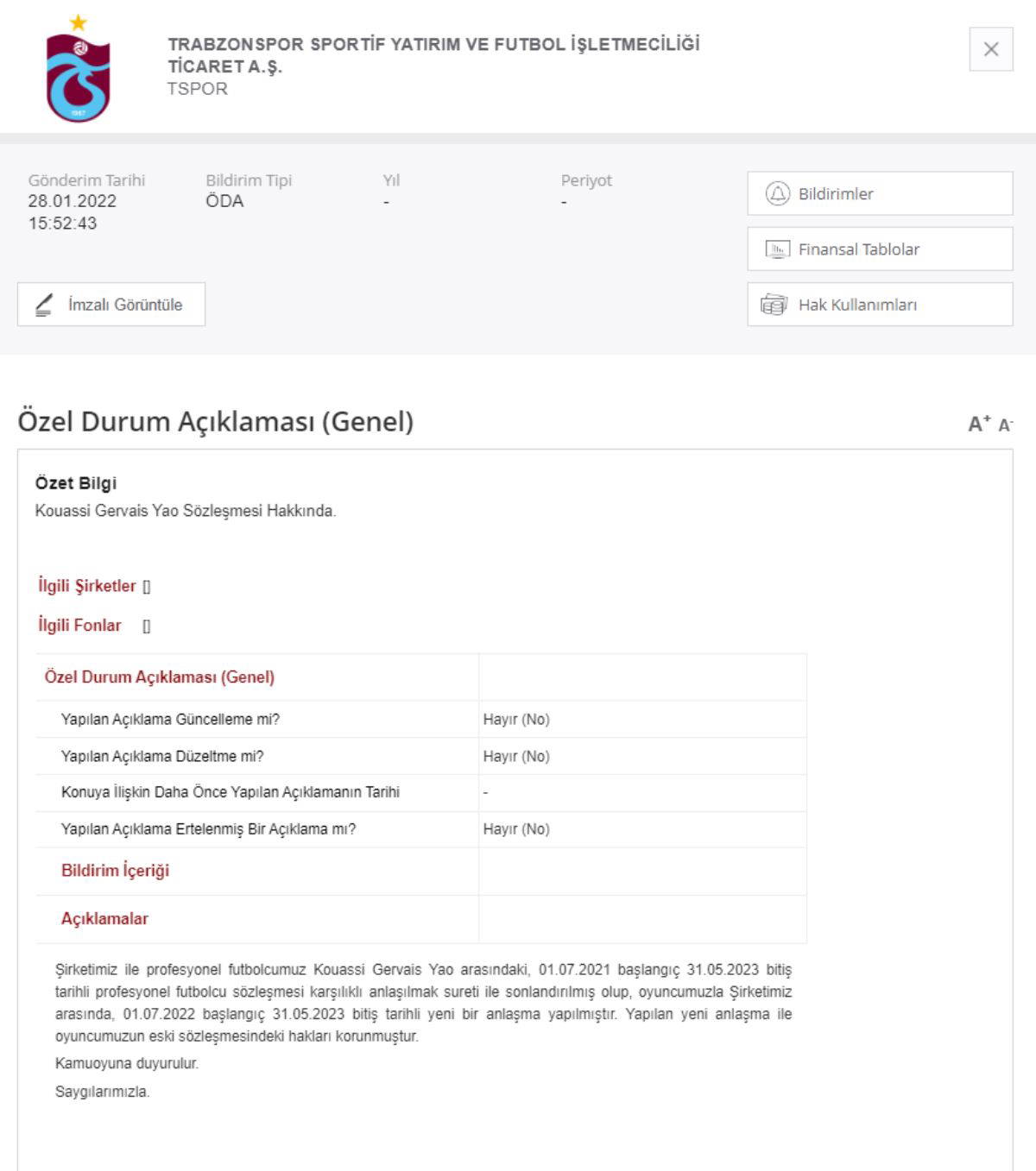 Bordo mavili kulüpten Kamuyu Aydınlatma Platformu'na (KAP) yapılan açıklamada şu ifadeler yer aldı, "Şirketimiz ile profesyonel futbolcumuz Kouassi Gervais Yao arasındaki, 01.07.2021 başlangıç 31.05.2023 bitiş tarihli profesyonel futbolcu sözleşmesi karşılıklı anlaşılmak sureti ile sonlandırılmış olup, oyuncumuzla Şirketimiz arasında, 01.07.2022 başlangıç 31.05.2023 bitiş tarihli yeni bir anlaşma yapılmıştır. Yapılan yeni anlaşma ile oyuncumuzun eski sözleşmesindeki hakları korunmuştur. Kamuoyuna duyurulur."