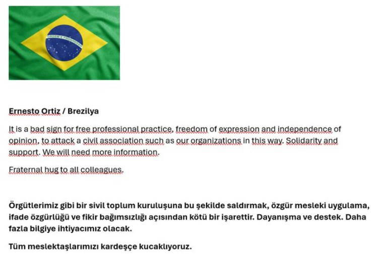 Derneğe kayyum atanmıştır. Anadolu'dan gelen gazeteci arkadaşların usulsüz bir şekilde Genel Kurul'a davet edildiği ve seçimi böyle kazandığım iddia edilmektedir. Hiçbir üyemiz satın alınamaz, oyunu peşkeş çektirmez. Anadolu'dan başlayan hamleyi çekemeyenler sonunda dersini gene alacaktır. Bu kısa süreçte gene Levent'te olacağımı bilmenizi isterim. Biz seçimle geldik, seçimle gideriz. Sevgi ve saygılarımla'' ifadelerini kullandı.