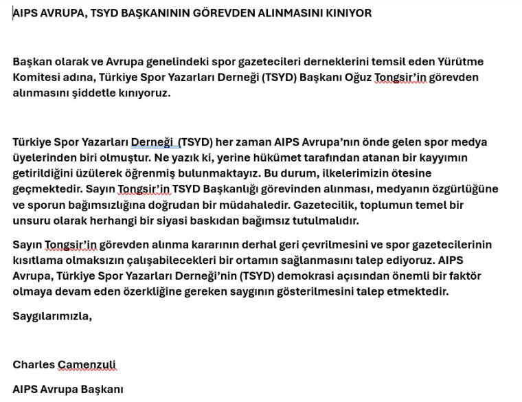 TSYD Başkanı Oğuz Tongsir, yaptığı açıklamada ''Değerli üyem, seçimi kaybetmiş malum kişilerin sosyal medyada yaptığı asılsız ihbar üzerine İçişleri Bakanlığı tarafından bir tedbir olarak geçici bir süre TSYD Başkanlığı'ndan uzaklaştırılmış bulunuyorum.