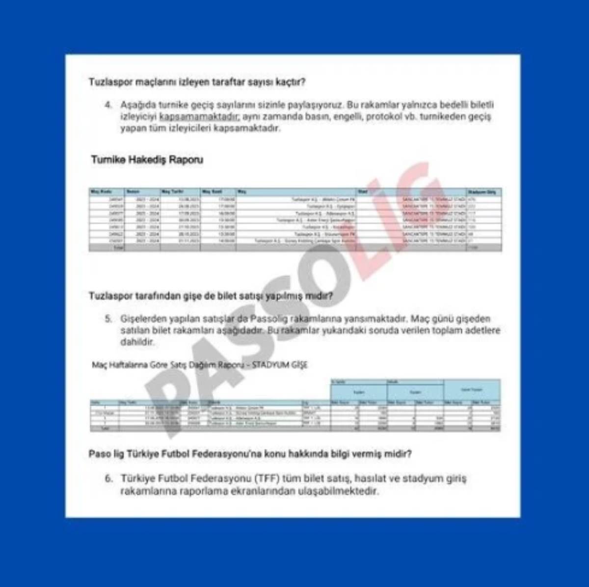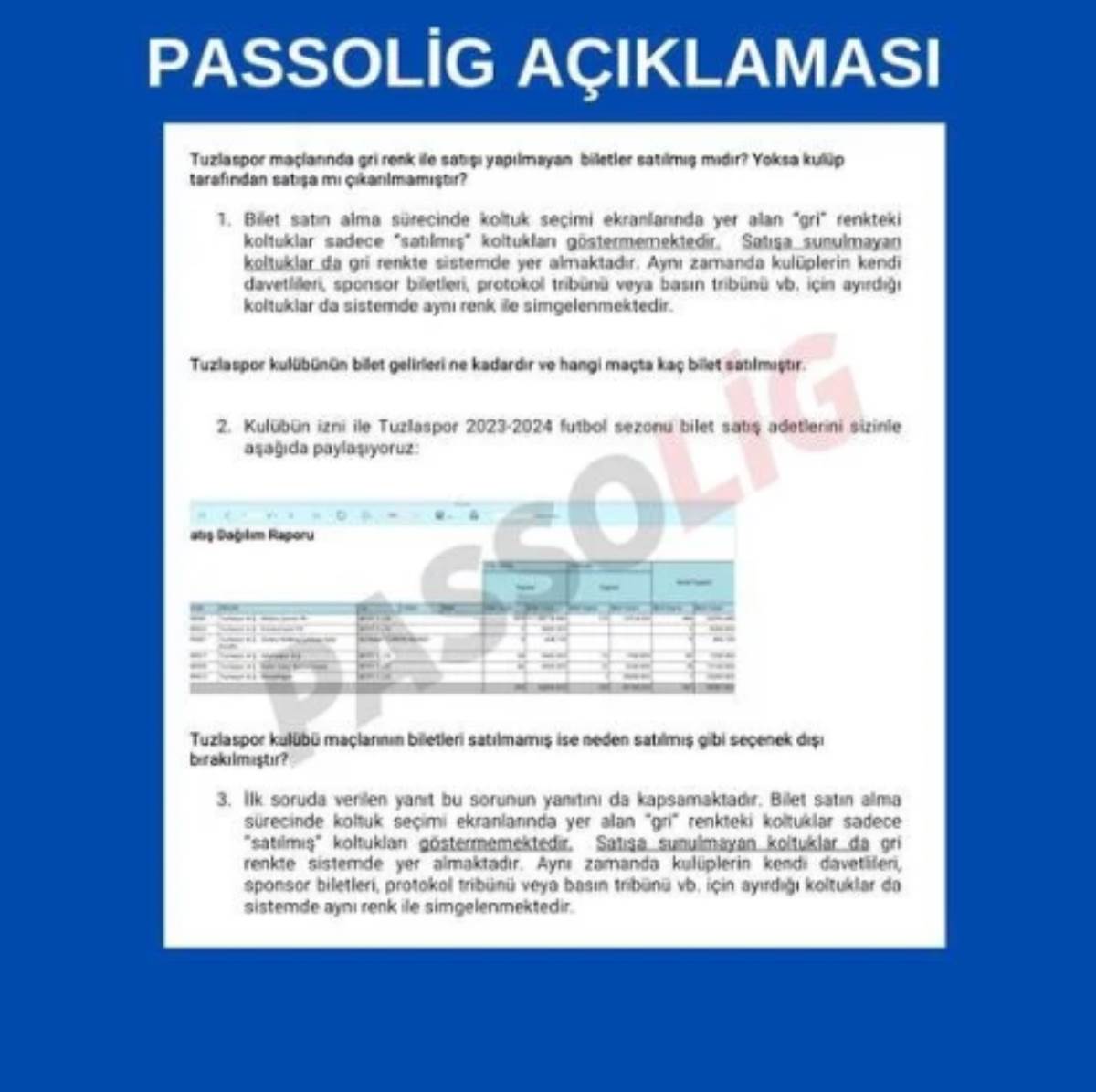 "Murat Ağırel tarafından 31 Ekim akşamı Halk TV canlı yayınında Kulübümüz Tuzlaspor'u karalamaya yönelik kampanya başlatılmış olup hukuki dayanaktan ve ispat edilmesi mümkün olmayan iddialar ileri sürülmüştür. Kulübümüzün müsabakalarda stadın tamamına ait biletleri fahiş fiyatlar ile satarak para akladığı yönündeki gerçek dışı iddialar ilk günden beri tarafımızca reddedilmiştir. Canlı yayında yüksek fiyattan satılmış olduğu iddia edilen biletlerin, Passolig tarafından tanınan ücretsiz davetiyeler olduğu ve yüksek fiyat belirlemenin tek amacının tribün avantajını korumak olduğu Kulübümüz tarafından kamuoyuna duyurulmuştur.