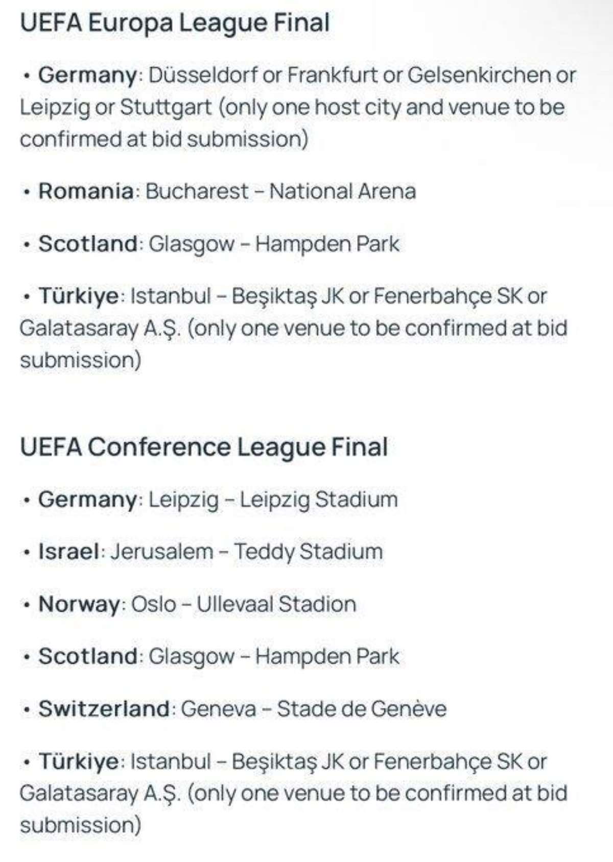 UEFA, Türkiye'nin 2026 ve 2027 yıllarındaki UEFA Avrupa Ligi ve UEFA Avrupa Konferans Ligi final maçlarını düzenlemek için teklif yaptığını açıkladı.