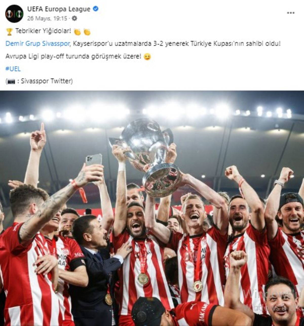 Sivasspor, Türkiye’nin ardından UEFA’nın da gündemine oturdu. UEFA Avrupa Ligi’nin resmi sosyal medya hesabından, Sivasspor’un Ziraat Türkiye Kupası’nı kazandığı fotoğrafları paylaşıldı.