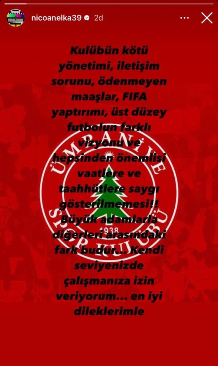 Anelka yaptığı paylaşımda, "Kulübün kötü yönetimi, iletişim sorunu, ödenmeyen maaşlar, FIFA yaptırımı, üst düzey futbolun farklı vizyonu ve hepsinden önemlisi vaatlere ve taahhütlere saygı gösterilmemesi!! Büyük adamlarla diğerleri arasındaki fark budur. Kendi seviyenizde çalışmanıza izin veriyorum... en iyi dileklerimle" ifadelerini kullandı.